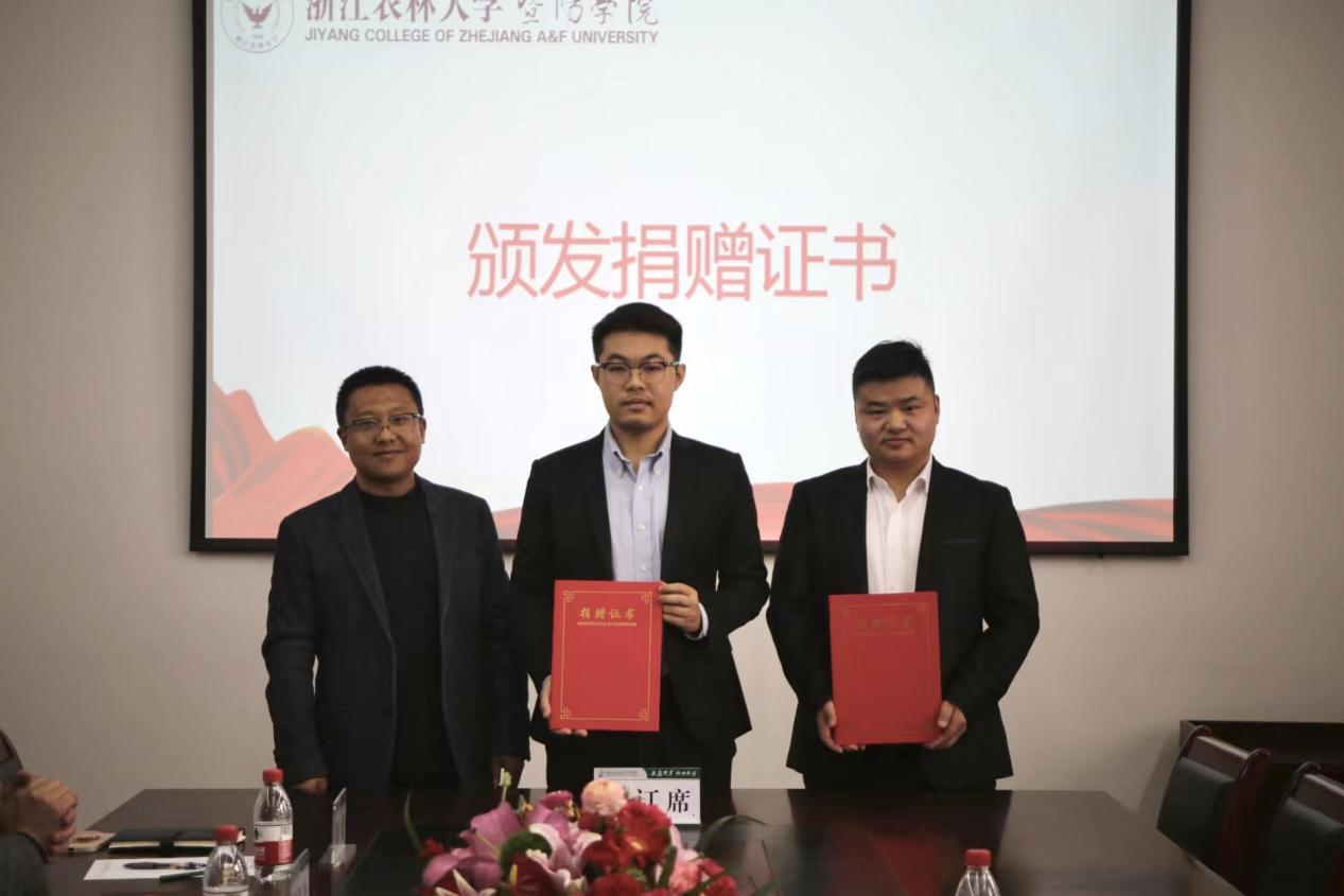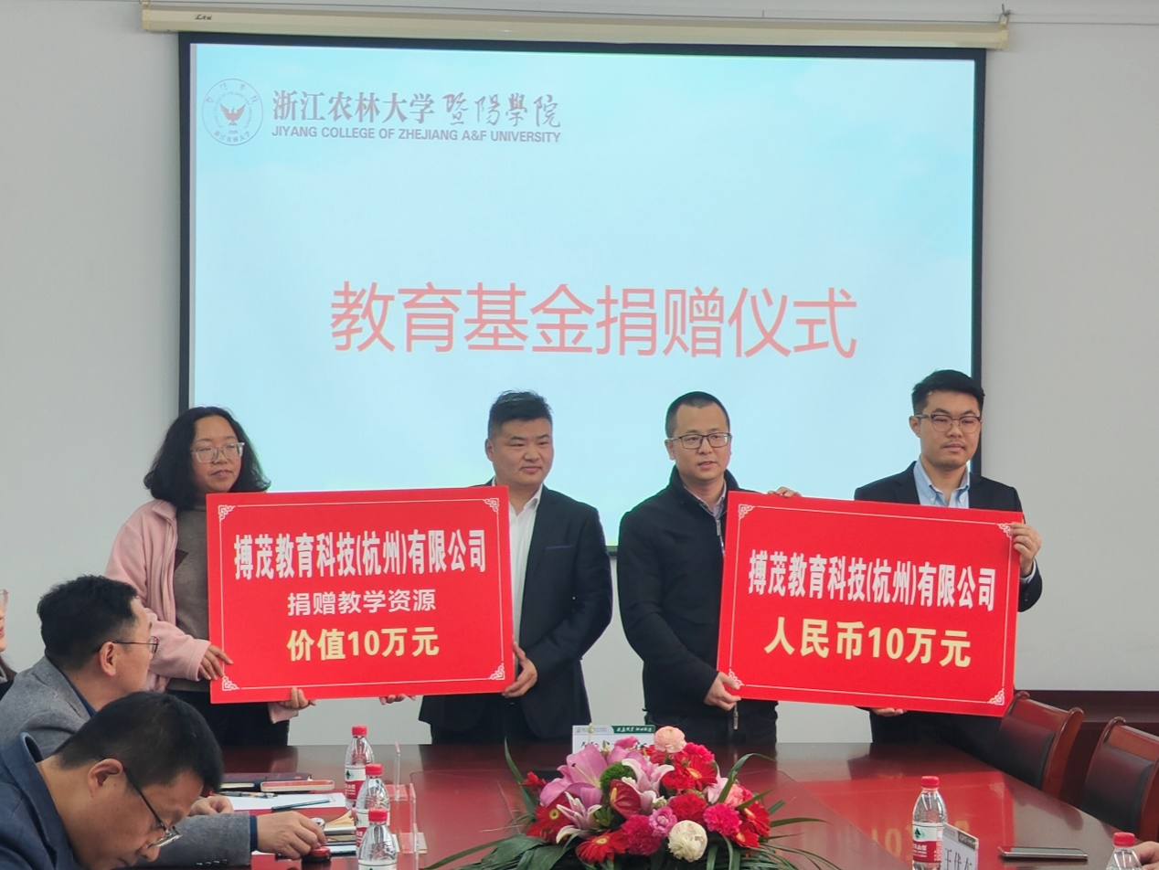 社会合作部主任王钟、学工部主任徐春霞代表学院接受搏茂教育科技(杭州)有限公司对商学院现金十万元及价值十万元教学资源的捐赠。