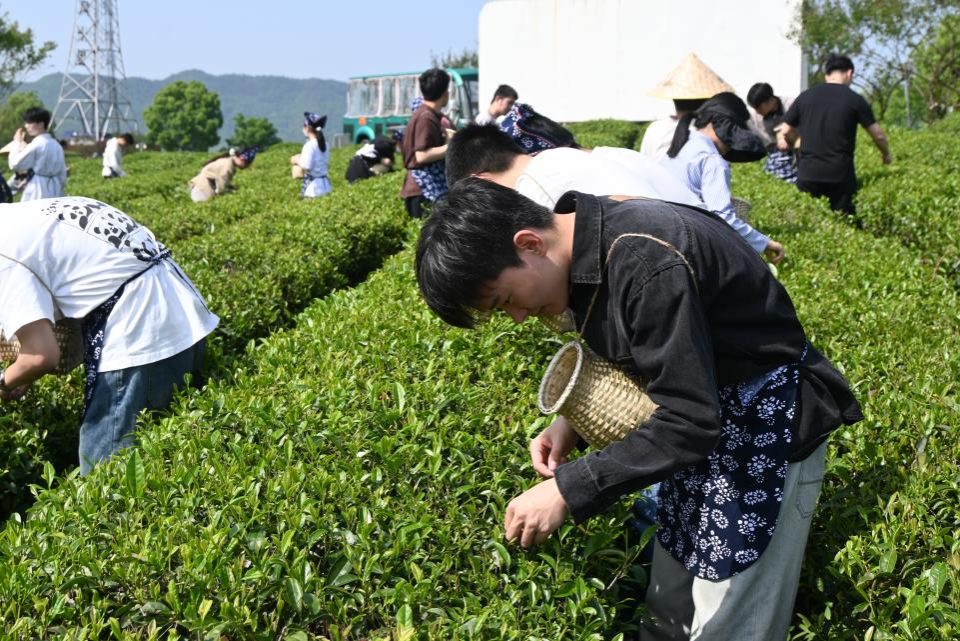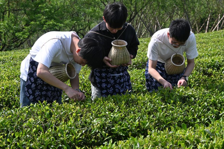 随后,全体师生党员来到东和乡茶山,同志们身系竹篓,弯着腰、低着头穿梭在茶园中,按照“一芽一叶”的标准进行采摘。采摘结束,大家纷纷开始学习制茶,包含筛拣、杀青、揉捻、干燥等。制茶师傅悉心指导,参与者们共同经历了制茶的全过程,深刻体验采茶、制茶的艰辛。