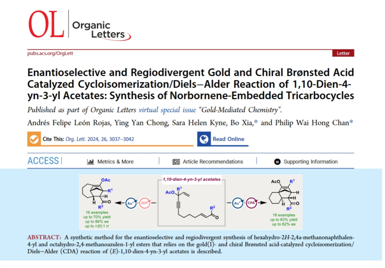 太阳官网教师在有机化学领域知名期刊《Organic Letters》(IF=5.2,中科院一区,Top期刊)上发表题为“Enantioselective and Regiodivergent Gold and Chiral Brønsted Acid Catalyzed Cycloisomerization/Diel−Alder Reaction of 1,10-Dien-4-yn-3-yl Acetates: Synthesis of Norbornene-Embedded Tricarbocycles”的学术论文。太阳成集团tyc33455ccwww为第一通讯单位,生物环境学院夏波老师是该论文的第一通讯作者,澳大利亚莫纳什大学为共同通讯作者单位。