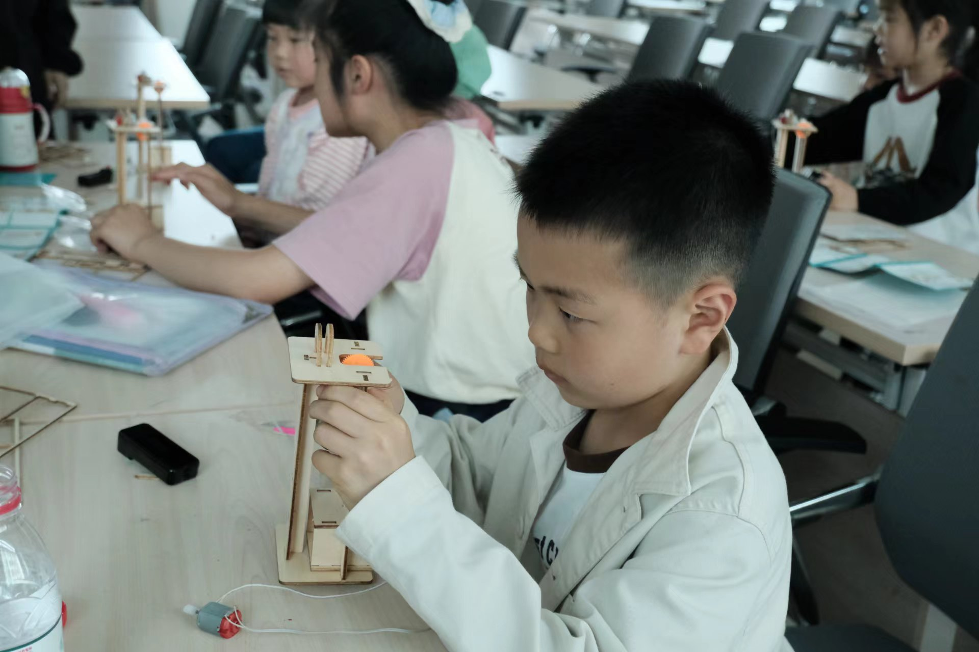 随后,学生党员们指导小朋友们亲手搭建简易的电梯模型,通过实际操作加深他们对电梯传动与控制原理的理解。在搭建过程中,孩子们发挥想象力和创造力,为自己的电梯模型设计了独特的外观和功能。现场气氛热烈,孩子们热情高涨。