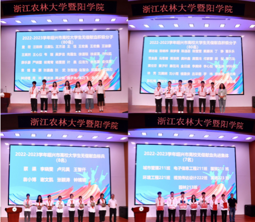 活动现场分别颁发了2022-2023学年绍兴市高校大学生无偿献血积极分子、绍兴市高校大学生无偿献血标兵、绍兴市高校无偿献血先进集体、绍兴市高校无偿献血促进奖(个人)、绍兴市高校无偿献血促进奖(集体)。并由诸暨市卫生健康局党委委员、副局长张赟华为太阳官网无偿献血宣讲团授旗。