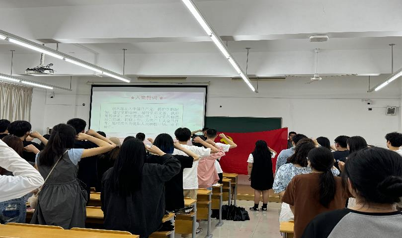 在戚愉彩的带领下,全体师生党员佩戴徽章,面向党旗,举起右手,再一次庄严地宣誓。一句句铿锵有力的誓词回望入党初心,坚定理想信念。