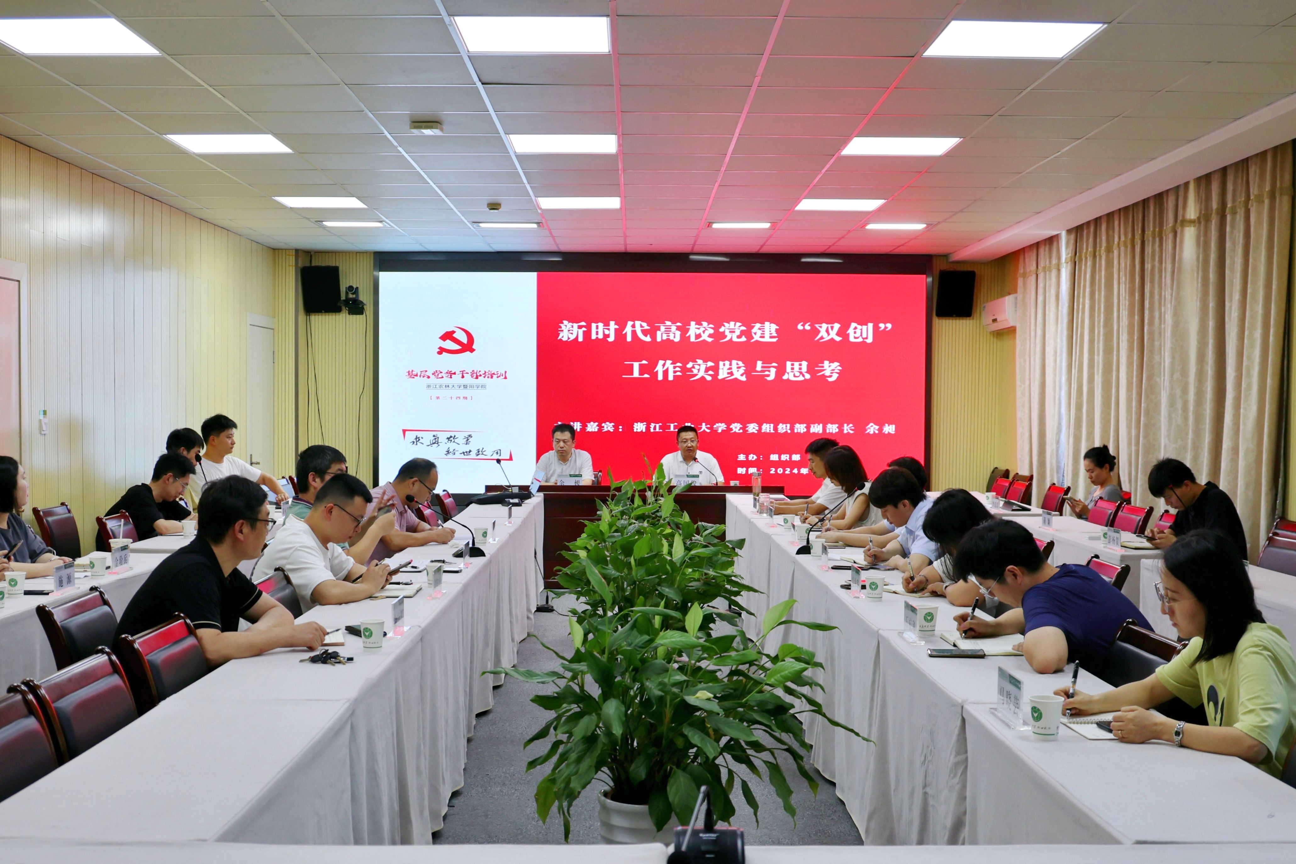 此次培训邀请了浙江工业大学地理信息学院党总支书记余昶作专题报告。余昶以《新时代高校党建“双创”工作实践与思考》为主题,从近年来高校基层党建的重点任务、“双创”工作思路、浙江工业大学基层党建创新与实践、“双创”申报书的撰写技巧等方面,深入浅出地讲述了以基层党建创新全面推动党建与事业融合发展的路径与思考。余昶立足办学实际,对照“六个过硬”、“五个到位”、“七个有力”,结合党建创新具体做法,详细阐述了高校基层党建“标准建设”“对标争先”“一融双高”的内涵和要求,深入阐释了“双创”工作的思路和重点,系统介绍了“双创”工作的实践探索和经验总结。