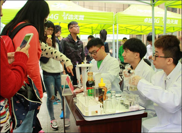 开幕式后,诸暨市科学技术协会工作人员和生物环境系食品专业的师生们开展了科普知识图片展览活动,进行了如何正确认识添加剂、快速检测食品中残留农药与化学物质以及常见食品鉴伪等操作的现场实验及讲解,为现场师生带来了一场别开生面的现场科普教学课。