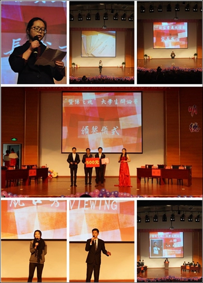 闭幕式上,语言文化节的精彩历程一一展现。首届“校园超级演说家”的冠军黄蕾同学为我们带来了一段诙谐幽默的脱口秀;“异域之风”英语风采大赛中的获奖选手周玥和叶俊卿同学一起畅谈了他们的梦想,带来了一场别开生面的听觉盛宴;“以心书情,尺素天涯”一封家书美文大赛为同学们提供了一个用笔尖抒发情感的平台,本次闭幕式更是为同学们表达感恩之情、父母抒发关爱之情提供了契机,未到现场的家长们精心拍摄的视频感动了现场所有观众;第九届“暨阳之魂”大学生辩论赛的表演赛在一首《常回家看看》后拉开了序幕,八位优秀辩手围绕着“狭路相逢智者胜还是勇者胜”展开了激烈辩论,他们口若悬河、唇枪舌剑博得场下掌声连连。期间,到场的嘉宾为语言文化节各个活动中的获奖选手颁奖。