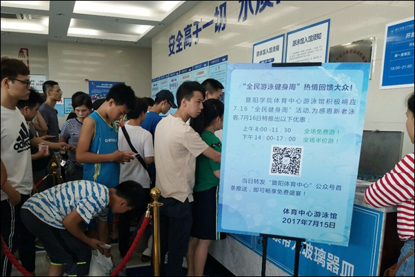 为弘扬游泳文化,推进全民健身,感恩回馈大众,体育中心游泳馆于7月16日开展了“上午免费游,下午半价游”活动。本次活动得到广大诸暨市民的积极响应,当日入场人次突破千人,场内气氛十分热烈。活动的举办,进一步普及了我市游泳健身活动。