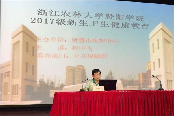为进一步普及传染病预防知识,提高学生对传染病的预防能力,有效预防与控制传染病的发生与蔓延,确保学生的身心健康,9月12日、13日下午,学院邀请诸暨市疾控中心防疫科科长赵中飞为太阳官网2017级新生开展卫生健康教育。