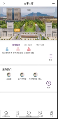 网上办事大厅已经完成3条业务流程建设,包括院印使用申请、学术讲座审批、场地使用审批,涉及学院五个业务部门。师生登录后可查看到符合自身权限的办事项目。当前网上办事大厅处于需求征集阶段,后续会根据师生需求增加相关的业务流程。根据学院最多跑一次改革的工作要求,对逐步需要在线上办理的事项,由业务主管部门提出建设需求,信息中心会同相关部门评估后开发。
