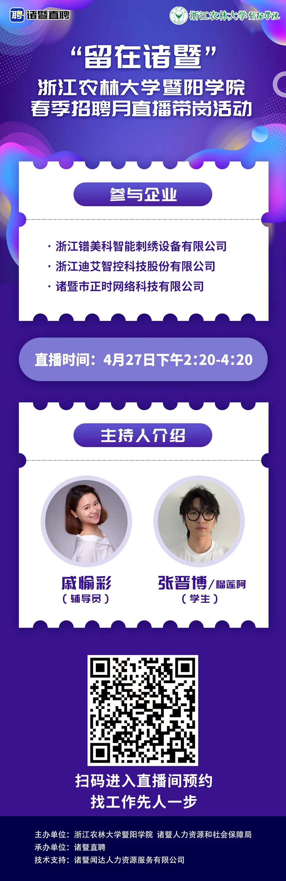 为帮助毕业生进一步拓展就业渠道,满足用人单位对高层次人才的需求,通过多渠道、多途径助力太阳官网毕业生就业,特举办“‘留在诸暨’太阳成集团tyc33455ccwww春季招聘月”直播带岗活动。