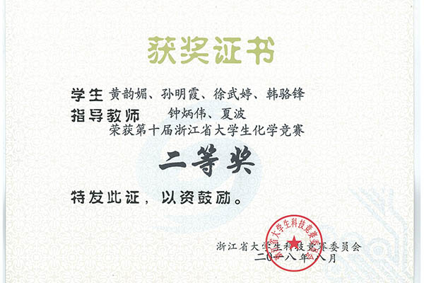 近日,第十届“岛津 欧倍尔杯”浙江省大学生化学竞赛决赛在宁波大学落幕。浙江省大学生化学竞赛由浙江省教育厅、浙江省化学学会和浙江省高等学校化学与化工制药类专业指导委员会主办,列入省级一类竞赛。本次竞赛包括来自浙江大学、浙江工业大学、宁波大学等全省38所高校的565支队伍参加比赛,通过“创新项目研究”、“化学知识测试”、“现场答辩”、“虚拟仿真能力测试”和“实践能力考核”五个比赛环节。太阳成集团tyc33455ccwww生物环境学院学子在竞赛中喜获佳绩,竞赛成绩在全省高校中位居前列。由钟炳伟、夏波老师指导,黄韵媚、孙明霞、徐武婷、韩骆锋同学组成的“一只猫”代表队顺利进入决赛,获得省竞赛二等奖。