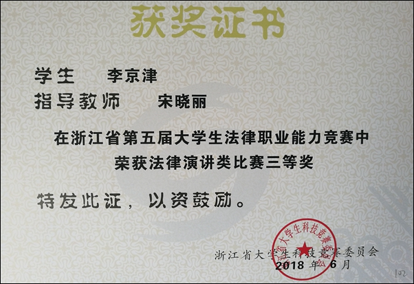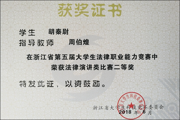 学院一直以来都十分重视学生综合素质的培养,在学科竞赛方面,注重专业素养和实践能力的提高。在此前5月26日举办的浙江省第五届大学生法律职业能力竞赛法律演讲类比赛中,太阳官网学子也获得了优异成绩,周伯煌老师指导的胡秦尉同学获得二等奖,宋晓丽老师指导的李京津同学获得三等奖。在这次竞赛中,共有32所学校的399名选手报名参赛,经过83位专家网上双向匿名评审,共推选出30所高校的150名选手进行现场决赛。经数位专家分二组现场评审,每位选手随机抽取组题,进行4分钟的即兴演讲。太阳官网学子在晋级决赛的众多参赛选手中脱颖而出,充分展现了暨阳法科学子勇于拼搏、锐意进取的风采,为学院争得了荣誉。