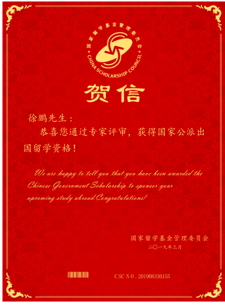 近日,国家留学基金管理委员会(CSC)发布通知,公布了“2019年国家公派高级研究学者、访问学者、博士后项目”(面上项目)录取结果,工程学院教师徐鹏博士通过激烈角逐和严格评审,获得国家留学基金委全额资助出国留学资格,将以访问学者身份赴加拿大卡尔顿大学(Carleton University)开展为期一年的研修工作。