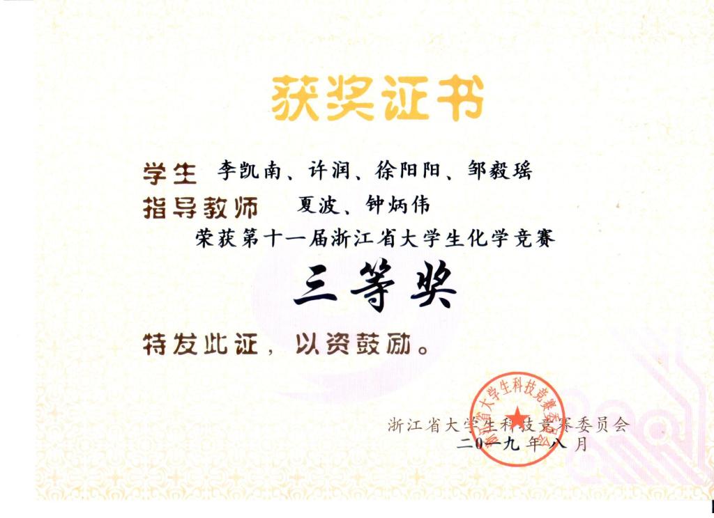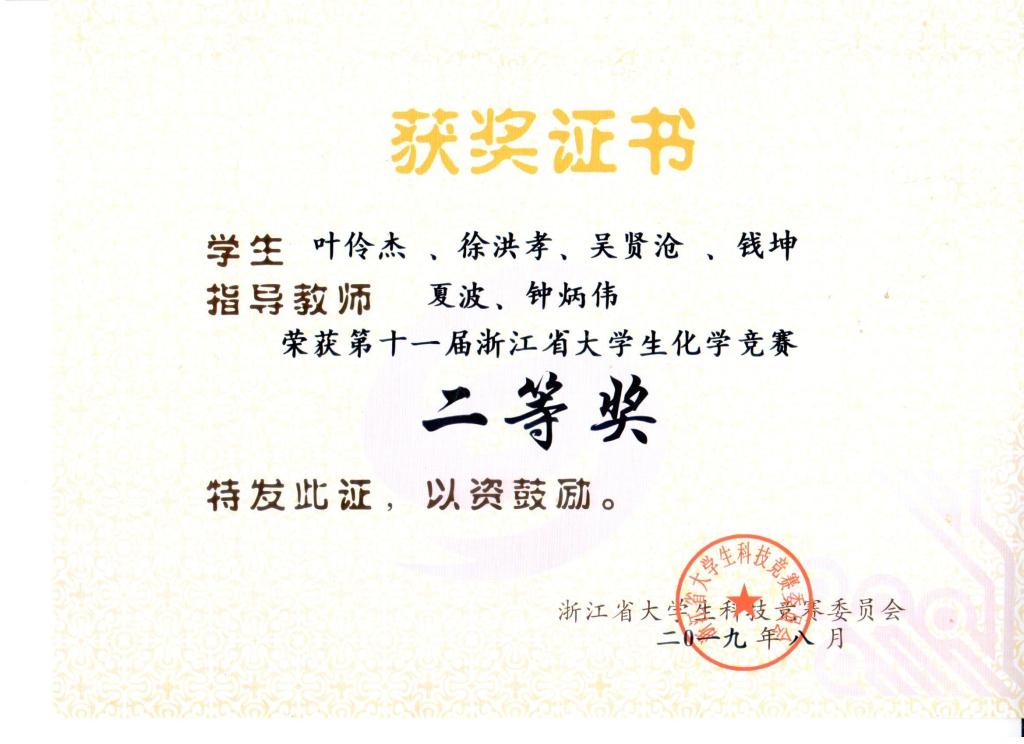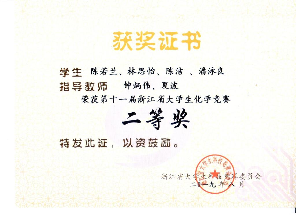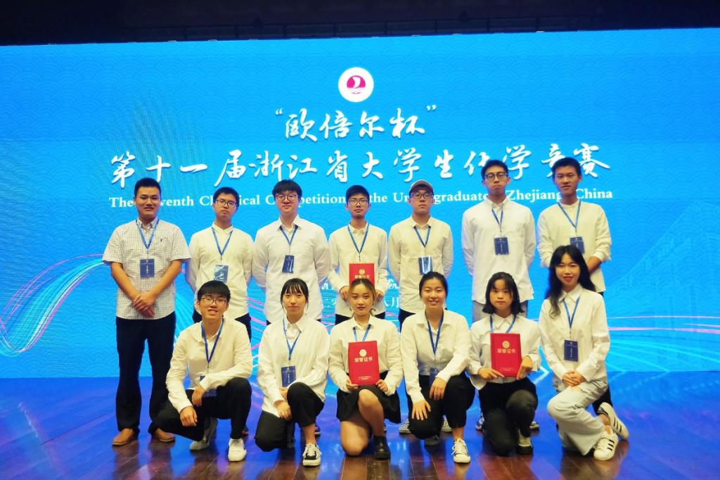浙江省大学生化学竞赛由浙江省教育厅指导,浙江省大学生科技竞赛委员会、浙江省高等学校化学类与化工制药类专业教学指导委员会和浙江省化学会共同主办,列入省级一类竞赛。本次竞赛包括来自浙江大学、浙江工业大学、宁波大学等全省36所高校的602支队伍参加比赛,通过“创新项目研究”、“化学知识测试”、“现场答辩”、“虚拟仿真能力测试”和“实践能力考核”五个比赛环节。经过激烈角逐,由钟炳伟、夏波老师指导,孙明霞、沈毅、叶子鹏、胡彪同学组成的“波噜噜吃比巴卜对西泡泡噗噗噗”代表队,陈若兰、林思怡、陈洁、潘泳良同学组成的“爱化学不秃头”代表队和叶伶杰、徐洪孝、吴贤沧、钱坤同学组成的“ACR”代表队获得省竞赛二等奖;李圆莲、傅旭倩、韩伊潇、李静宁同学组成的“70%乙醇”代表队和李凯南、许润、徐阳阳、邹毅瑶同学组成的“社会主义接班人队”代表队获得省竞赛三等奖。