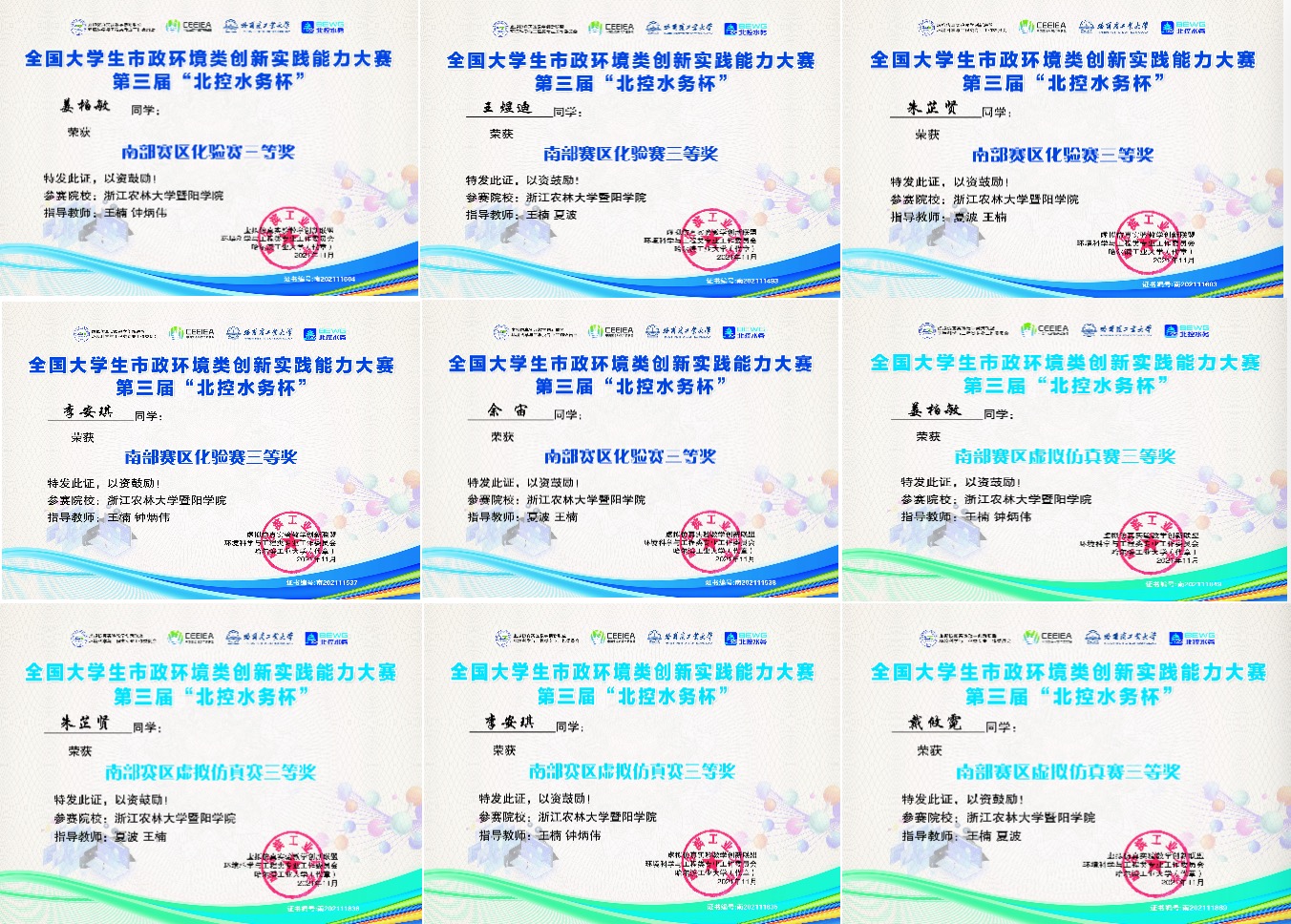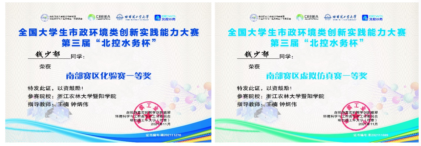本次竞赛包括来自复旦大学、同济大学、吉林大学、哈尔滨工业大学等全国160所高校的1500余人参加比赛,太阳官网钟炳伟、王楠和夏波三位老师,带领环境工程专业9名同学参加了该项大赛,通过“化验赛”和“虚拟仿真赛”两个比赛环节,经过激烈角逐,太阳成集团tyc33455ccwww生物环境学院学子在竞赛中喜获佳绩:环境工程2018级钱少郁同时荣获化验赛和虚拟仿真赛一等奖(全国第18名);彭佩玲同时荣获化验赛和虚拟仿真赛二等奖;戴攸霓、王煜迪分获化验赛和虚拟仿真赛二等奖;姜柏敏、李安琪、余宙、朱芷贤等分获化验赛和虚拟仿真赛三等奖。此次竞赛,太阳成集团tyc33455ccwww在高等级奖项数量上取得了历史性突破,竞赛成绩在全国高校中位居前列,位居全国独立学院第一位。