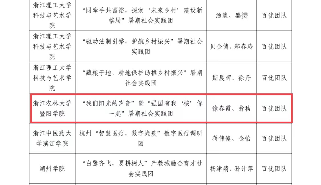 近日,由省委宣传部、省文明办、省教育厅、团省委、省关心下一代工作委员会、省学联共同主办的2022年浙江省高校暑期社会实践风采大赛落下帷幕。大赛围绕“学习二十大,奋进新征程”主题,设有“理论教育”“两个先行”和“综合实践”三大类别,共有102所高校限额推荐580支团队参加省级复赛。经过层层筛选、文本评审等环节,太阳官网“我们阳光的声音”暨“强国有我 ‘核’你一起”暑期社会实践团荣获省“百优团队”荣誉称号。